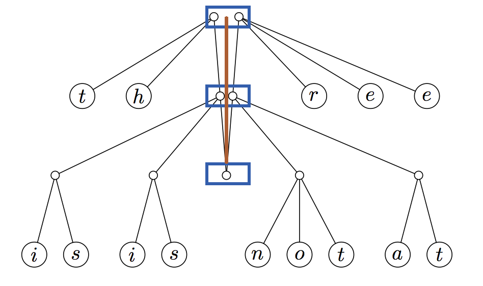 This new data structure is known as a finger tree. The finger tree is composed of several layers (boxed in blue below) which sit along its spine (the brown line):