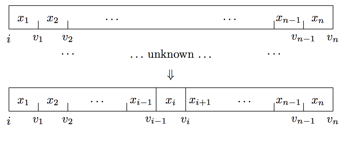 Each layer of the finger tree has a prefix (on the left) and a suffix (on the right), as well as a link further down the spine. The prefix and suffix contain values in the finger tree – on the first level, they contain values (2-3 trees of depth 0); on the second level, they contain 2-3 trees of depth 1; on the third level, they contain 2-3 trees of depth 2, and so on. This somewhat unusual property comes from the fact that the original 2-3 tree was of uniform depth. The edges of the original 2-3 tree are now at the top of the spine. The root of the 2-3 tree is now the very bottom element of the spine. As we go down the spine, we are traversing from the leaves to the root of the original 2-3 tree; as we go closer to the root, the prefix and suffixes contain deeper and deeper subtrees of the original 2-3 tree.